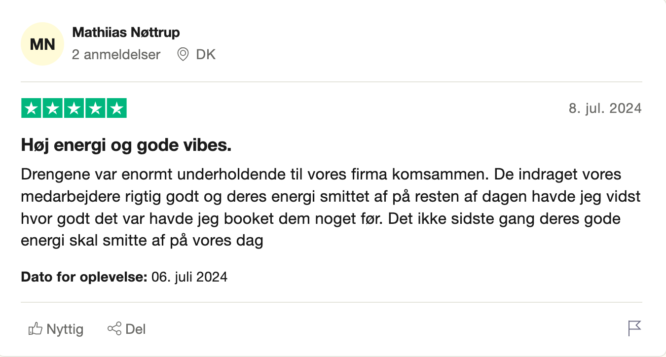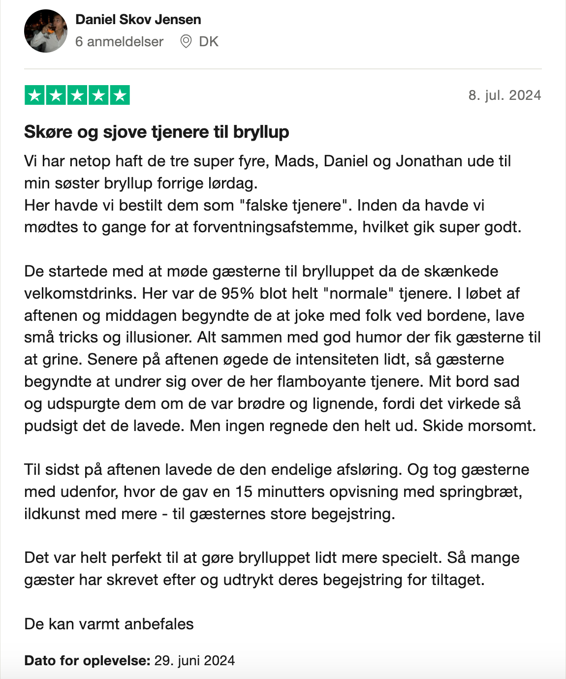 Vi var en gruppe veninder, der besluttede os for at prøve noget nyt – og 6 Men Show skuffede bestemt ikke! Fra det øjeblik lyset dæmpede, og musikken startede, var vi fanget af energien på scenen. Kombinationen af dans, akrobatik og humor gjorde det til en underholdende og festlig oplevelse.